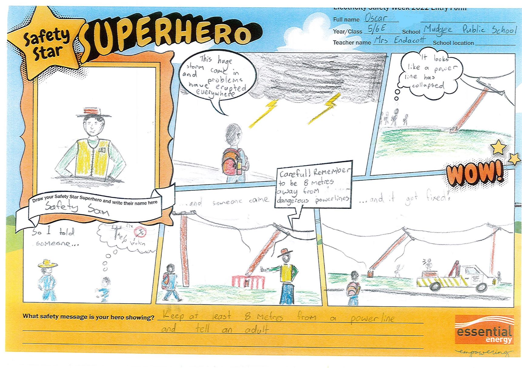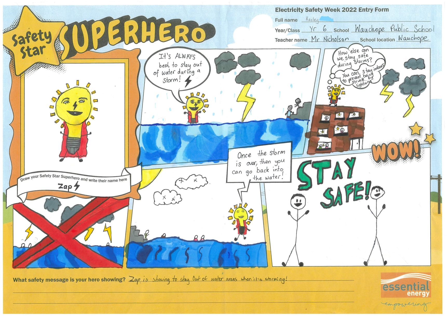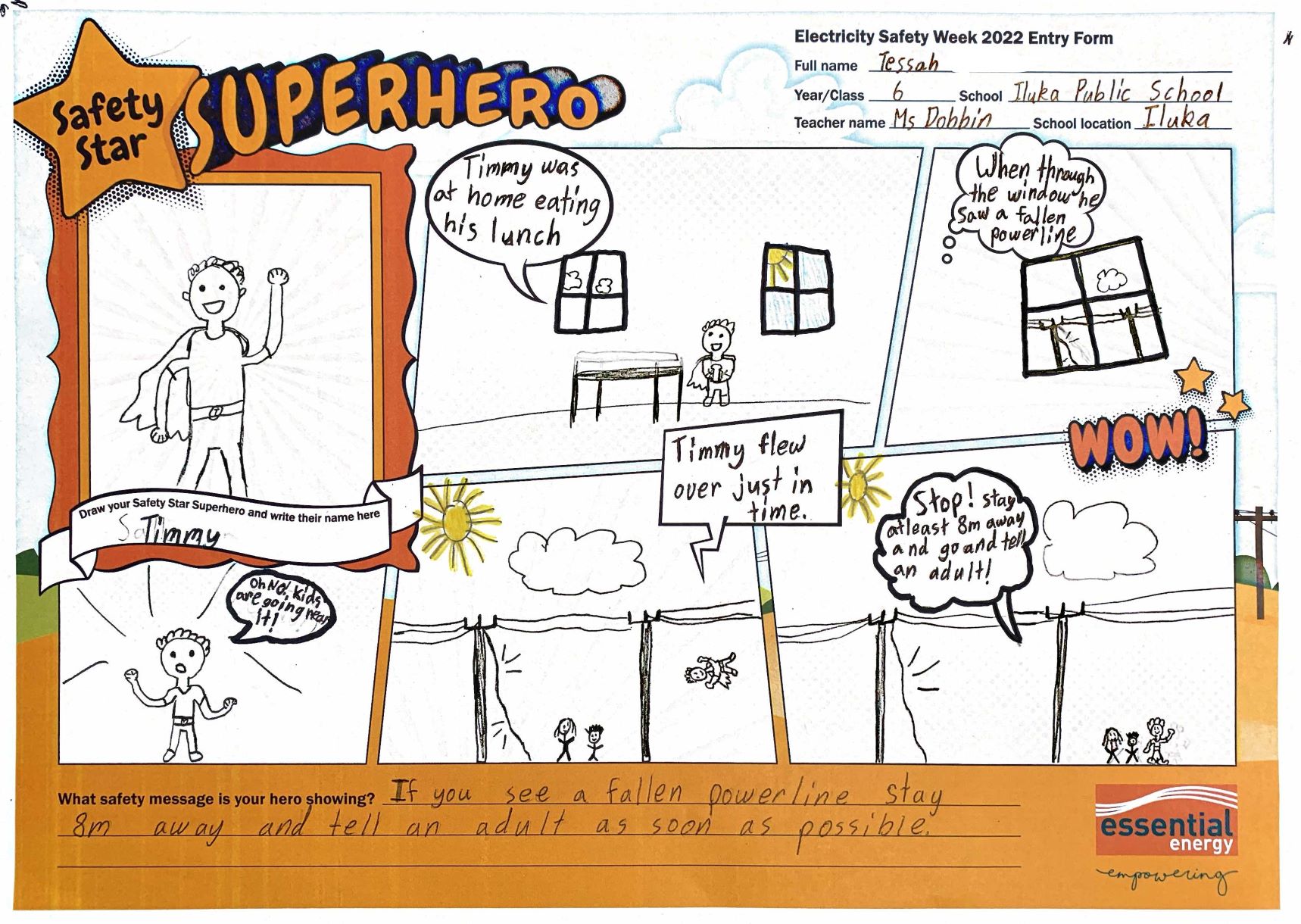 As part of Electricity Safety Week 2023, students in Years 5 to 6 across Essential Energy’s network are invited to enter our Safety Star Superhero comic strip competition. The comic should include the students Safety Star Superhero helping people stay safe around electricity, by highlighting one or more important electricity safety messages.